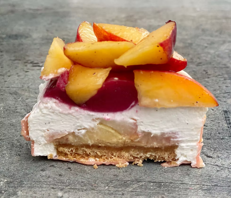Mixer la première partie des ingrédients, ajouter les blancs montés avec la vergeoise en 3 fois et ajouter la dernière partie avec le troisième tiers des blancs. Déposer des morceaux de pêche sur tout le biscuit, couler en cadre et cuire environ 15 minute à 160°. Déposer les sablé reconstitués, congeler sur le biscuit 24h.