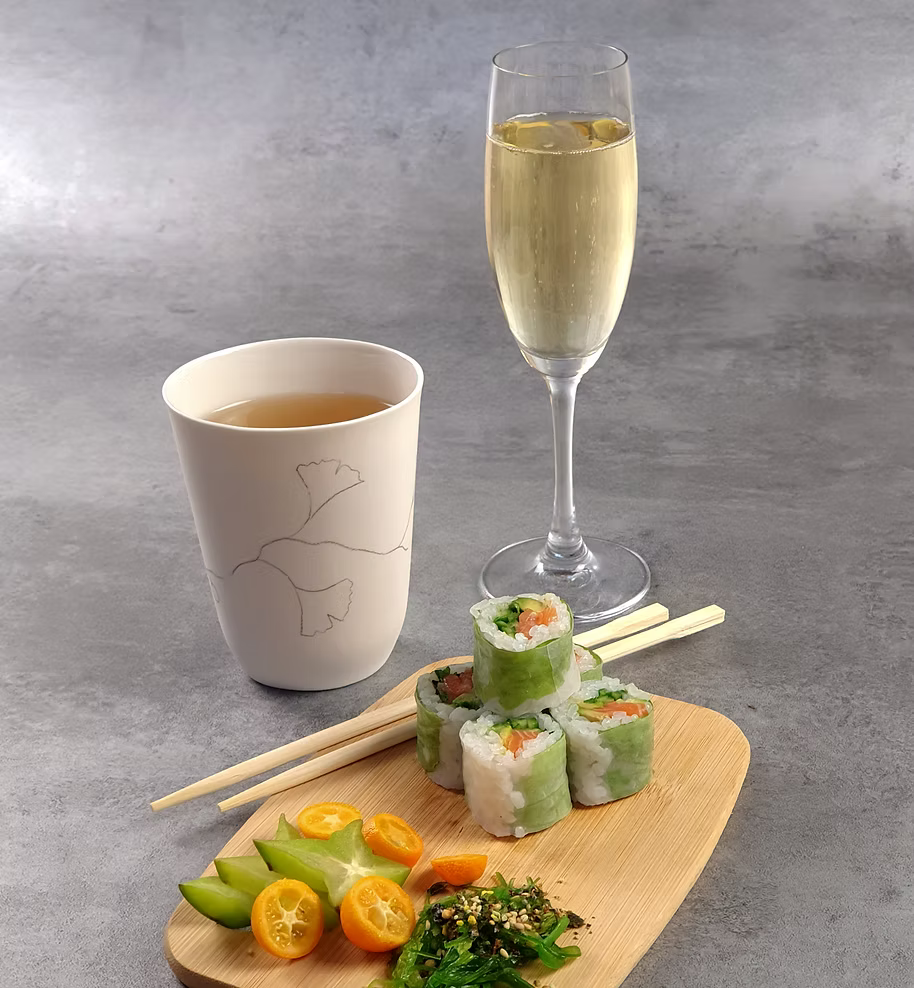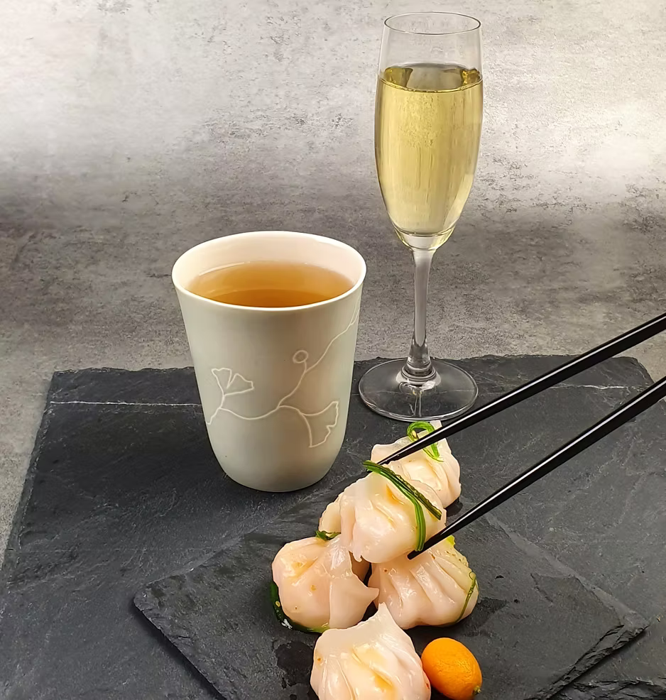 Les Maki au saumon sont présentés avec notre thé vert détox, Detoxology, les Ha-Kao aux crevettes avec l'Exubérance Impériale,